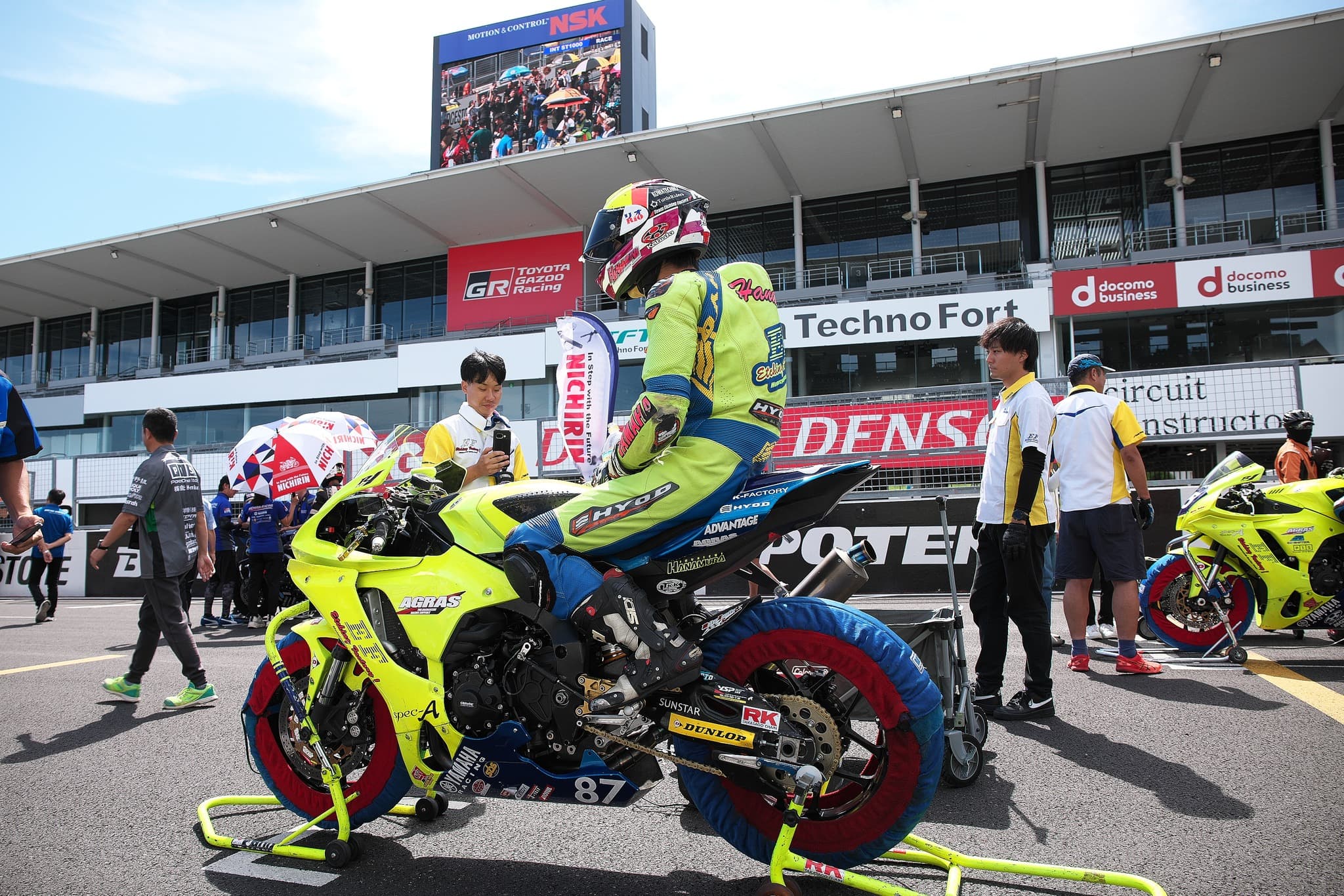 日曜日の決勝は、朝から太陽が路面を照らし暑い一日となりました。JSB1000の花村はスタートで出遅れましたが、JSB仕様の強者相手に粘り強く走り切り、6位入賞を果たしました。